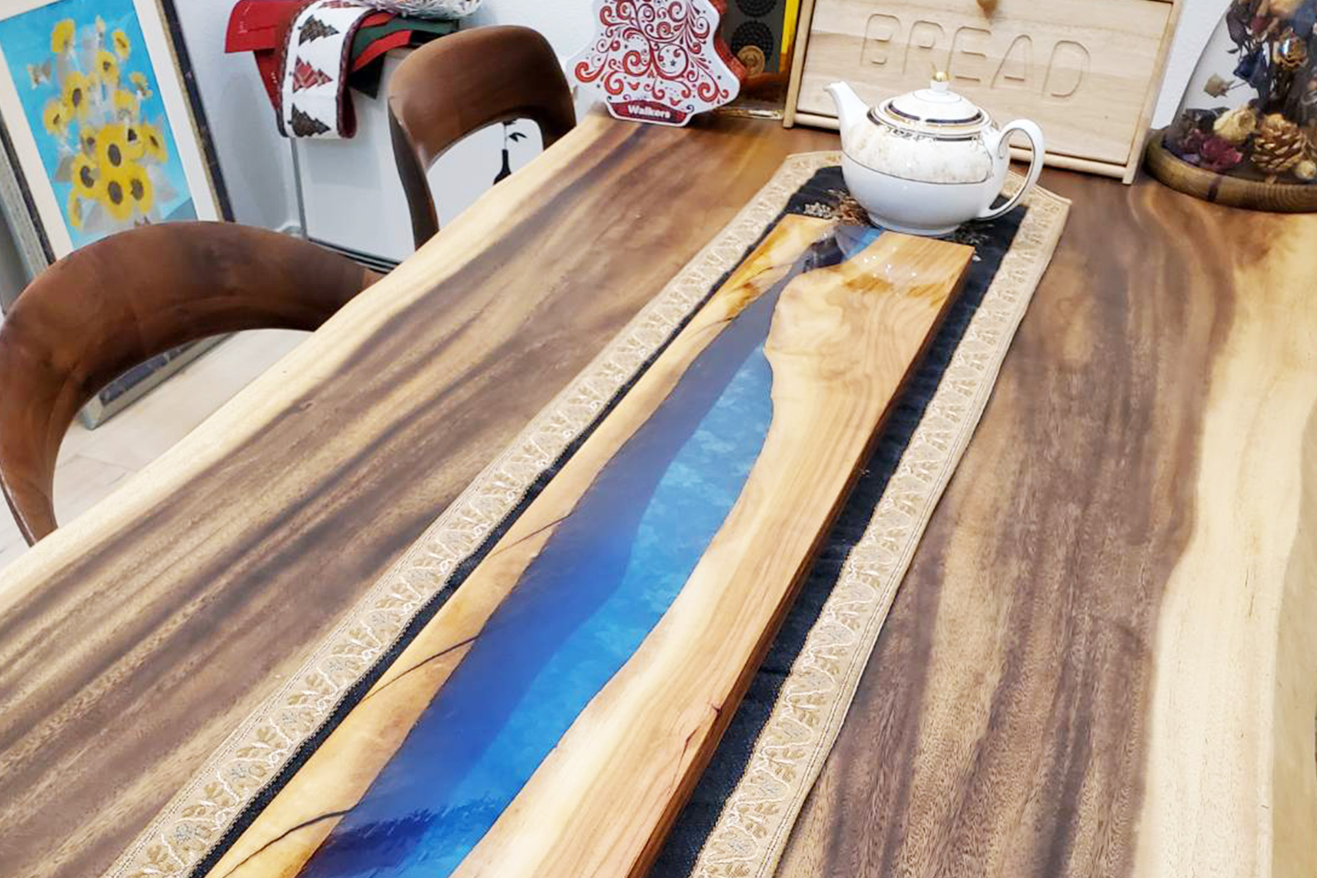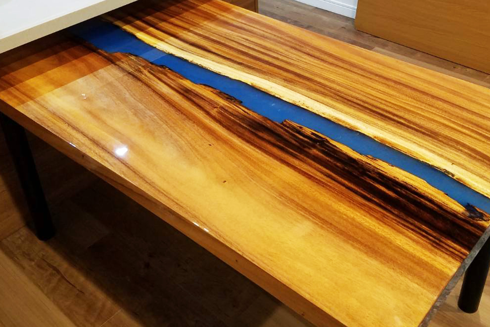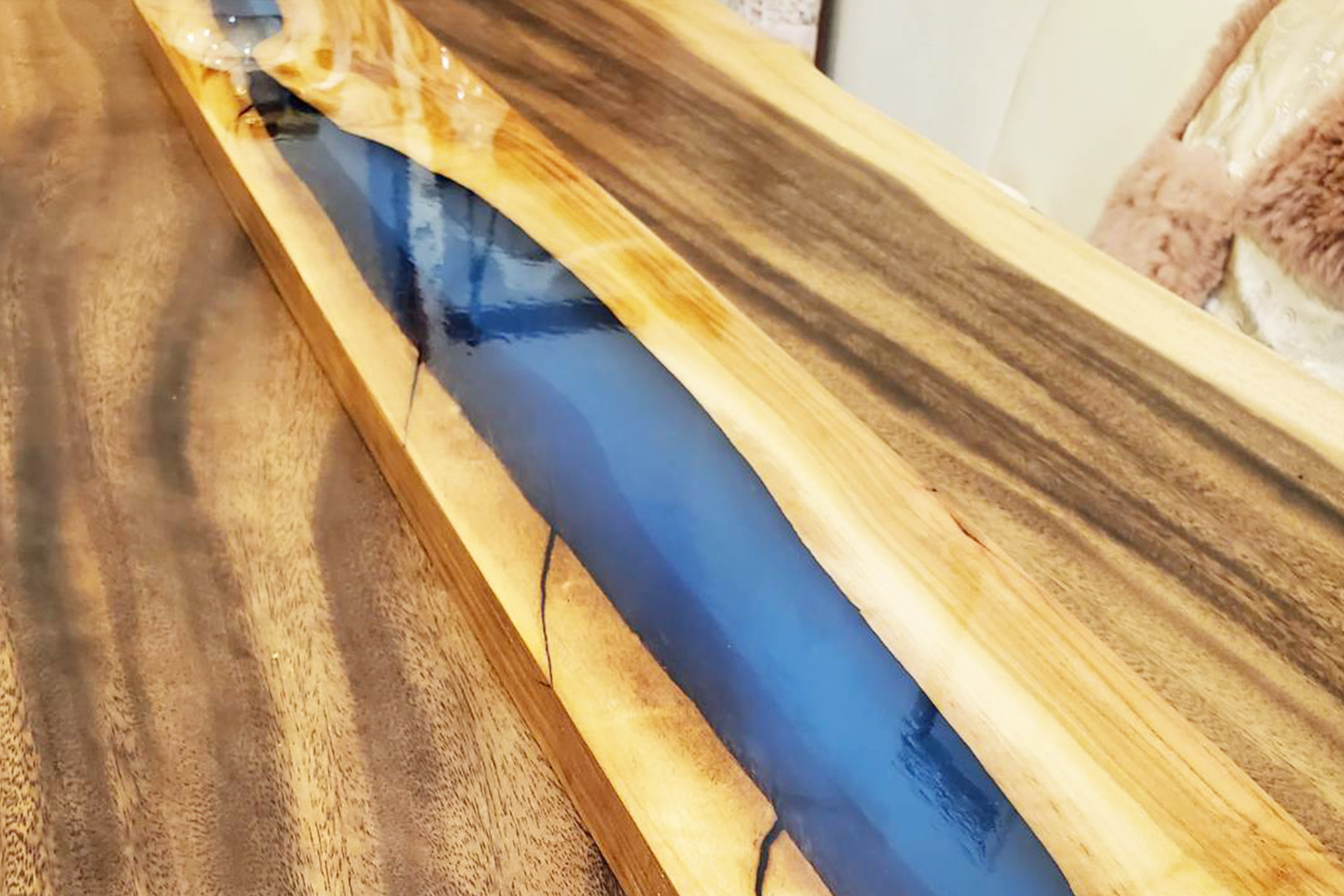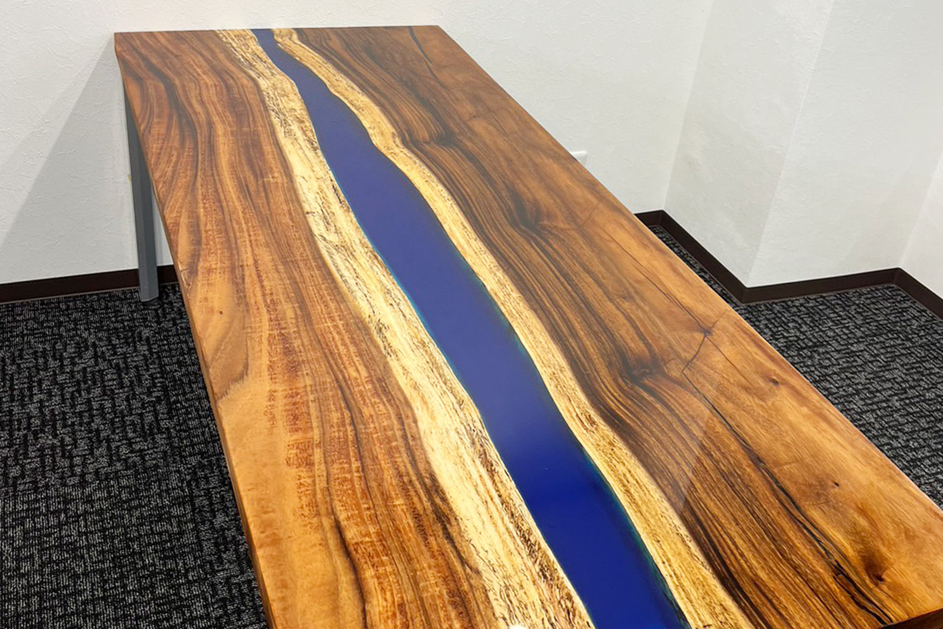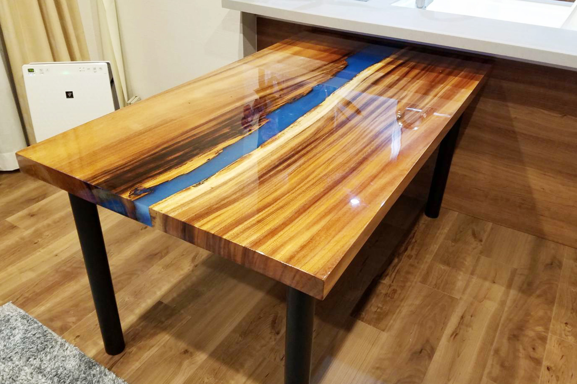 エポキシテーブルとは、テーブル天板に無垢材とエポキシ樹脂を充填し成形したものです。 木材と木材を樹脂によって繋ぎ固め、まるでテーブル上に川が流れているような美しい見た目から、リバーテーブルとも呼ばれています。 様々な色のエポキシ樹脂を流し込み、オリジナリティ溢れる作品を仕上げます。